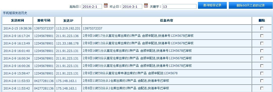 查询列表右则有多选框勾选后点击右下方的删除按钮可对短信历史进行批量删除。